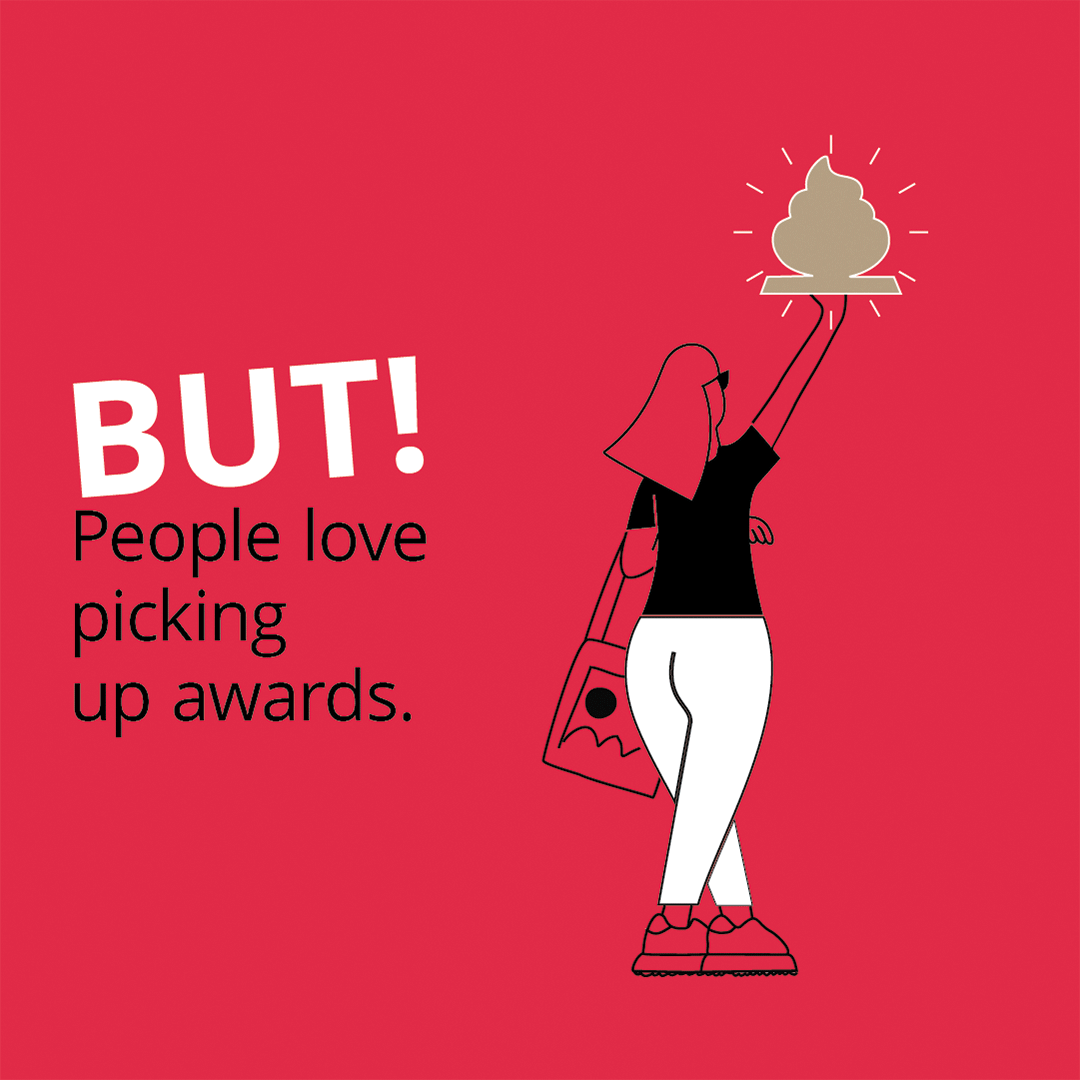 People don’t pick it up, it’s everywhere. Which got us thinking: how could we turn picking up dog shit into something people actually want to do? One thing became abundantly clear during our research: people hate picking up dog shit, but they love picking up awards – 1st place, last place, even just showing up gets you a ribbon. What if we applied this same principle to the dog shit dilemma?
